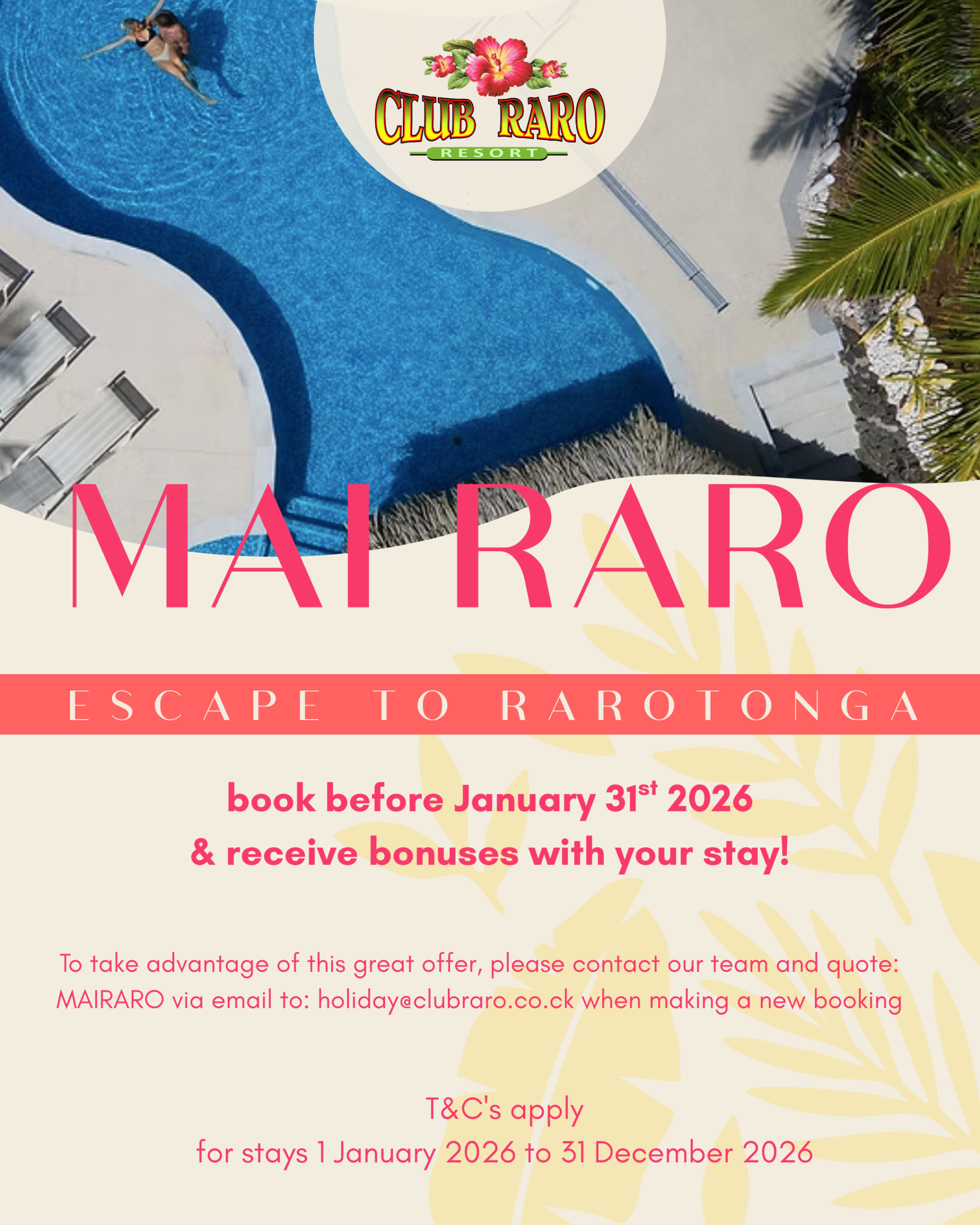 To take advantage of this great offer, please contact our team and quote: MAIRARO via email to: holiday@clubraro.co.ck or call directly +682 22415 to speak to our reservations team. when making a new booking.